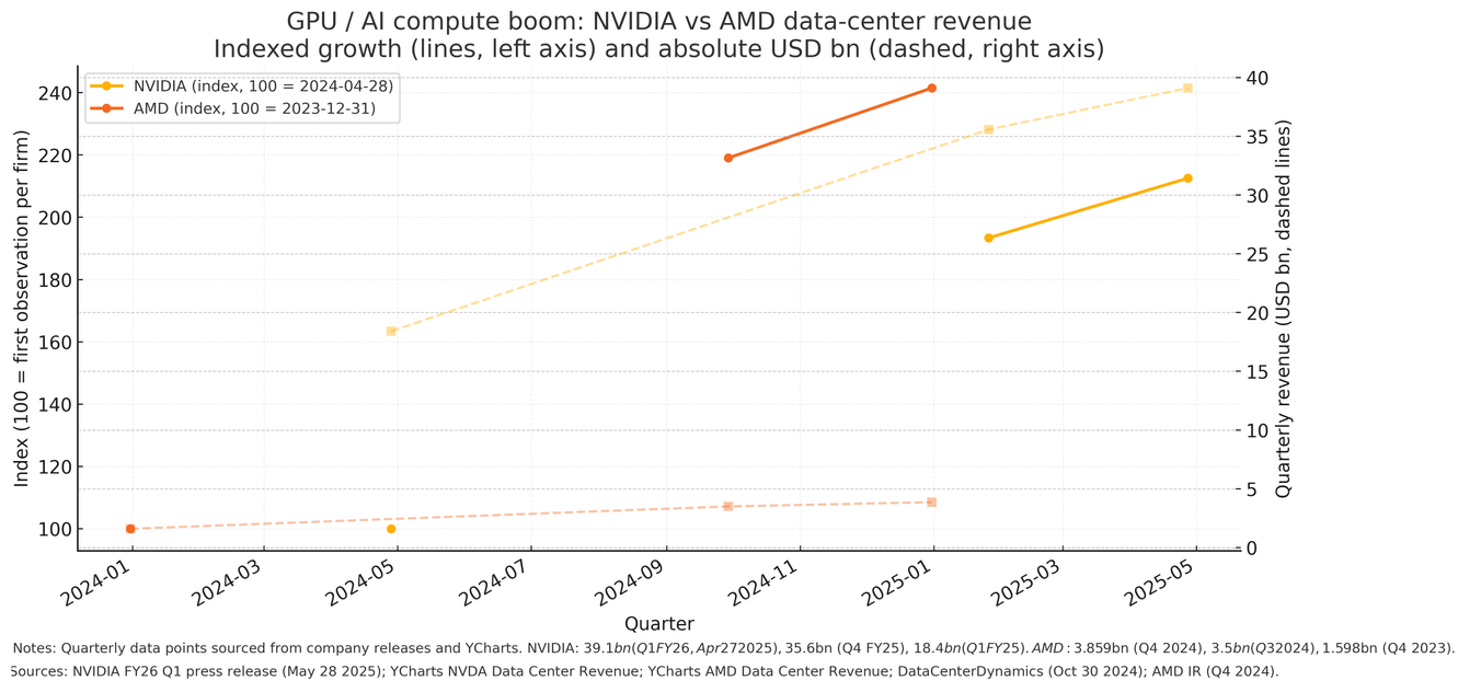 Dashed lines (right axis): the absolute quarterly revenue gap is stark. NVIDIA moves from 18.4bn → 35.6bn → 39.1bn in three quarters. AMD rises from 1.60bn → 3.50bn → 3.86bn. The scale differential is structural even as AMD’s growth rate is high.