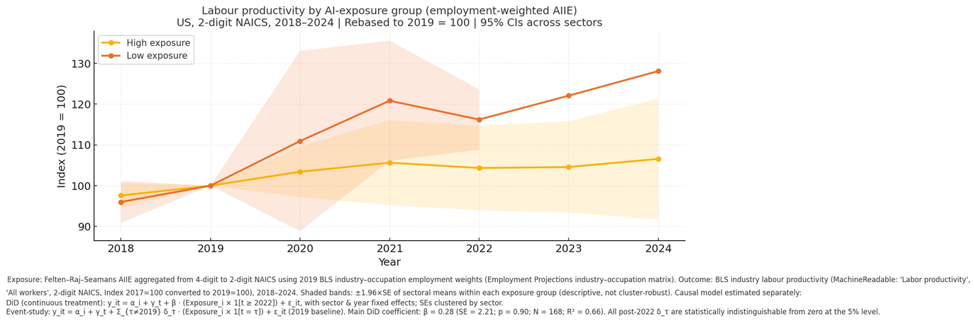 Exposure is Felten–Raj–Seamans AIIE, aggregated from 4-digit to 2-digit NAICS using 2019 BLS industry–occupation employment weights. Outcome is BLS industry labour productivity (MachineReadable tables), rebased to 2019 = 100. Shaded areas are 95% CIs across sectors within each group (descriptive, not cluster-robust). The gap between high- and low-exposure sectors is small and statistically indistinguishable from zero; the corresponding DiD estimate is β = 0.28 (SE = 2.21, p = 0.90).