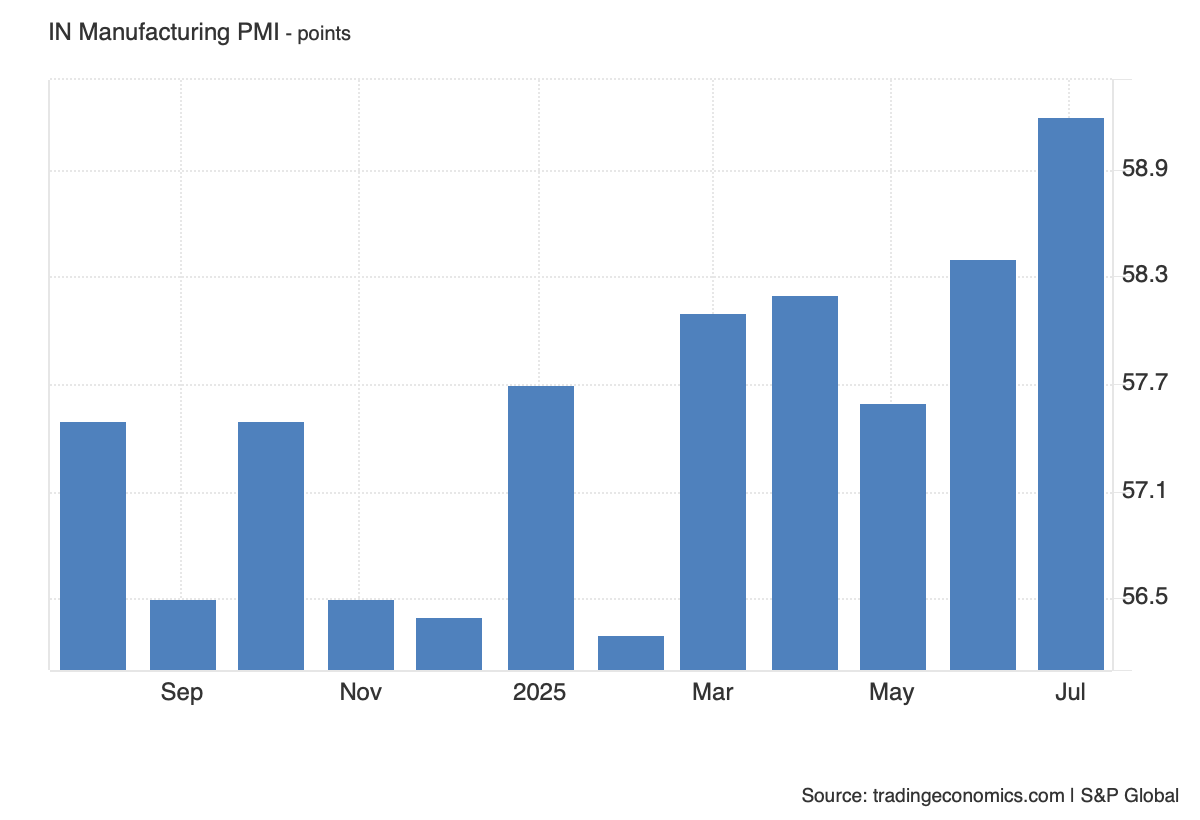 The strong PMI performance in July comes amid a broader economic narrative of India outperforming its peers in the Global South. With projected real GDP growth of 6.6% for FY2025–26 (IMF, 2025), India’s manufacturing momentum offers a structural offset to ongoing global trade and capital volatility. Moreover, the PMI reading supports Reserve Bank of India (RBI) forecasts that core industrial output will remain robust, especially if capital expenditure by both government and corporate actors sustains its current trajectory. These trends also enhance India’s position as a nearshoring destination for global firms reassessing supply chain risks out of China.